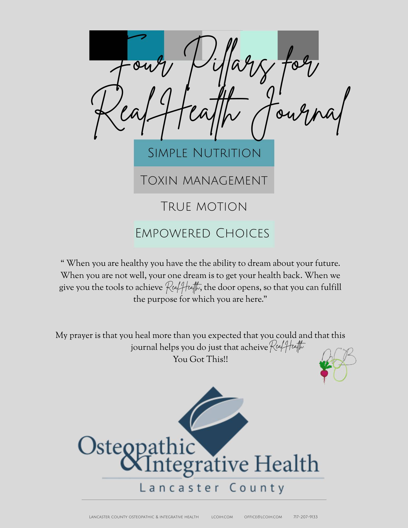 This journal will complement every tool you learn in The four pillars for real health guide. This 6 month journal will help you keep track of your progress as you create a 4 pillar plan for your health journey
